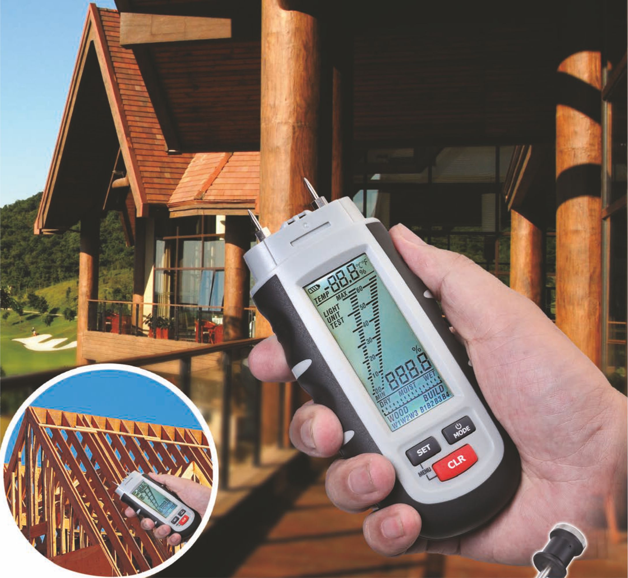 DT-125G оснащен встроенными измерительными щупами длиной 8 мм, которые позволяют проводить измерения внутри материала с высокой точностью. Для древесины предусмотрены три отдельных шкалы, каждая из которых оптимизирована под определенные виды древесины. Это обеспечивает высокую достоверность получаемых данных в диапазоне от 1 до 75% относительной влажности. Точность варьируется от ±1% в нижнем диапазоне до ±4% при высоких значениях влажности, что делает прибор особенно полезным при сушке древесины или проверке готовности материала к использованию.