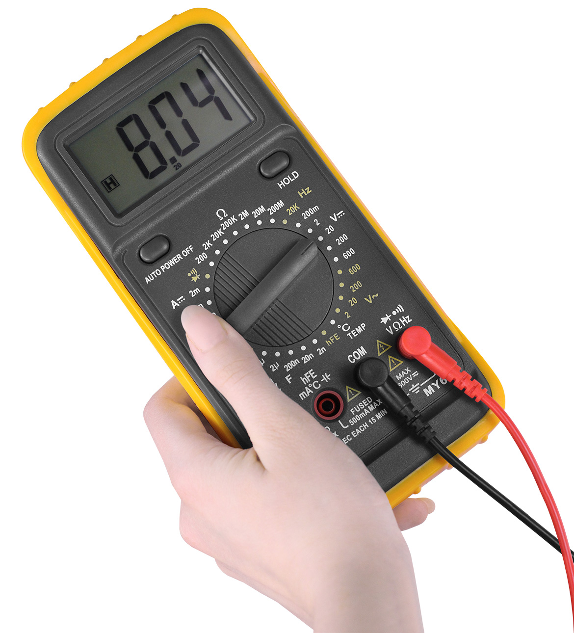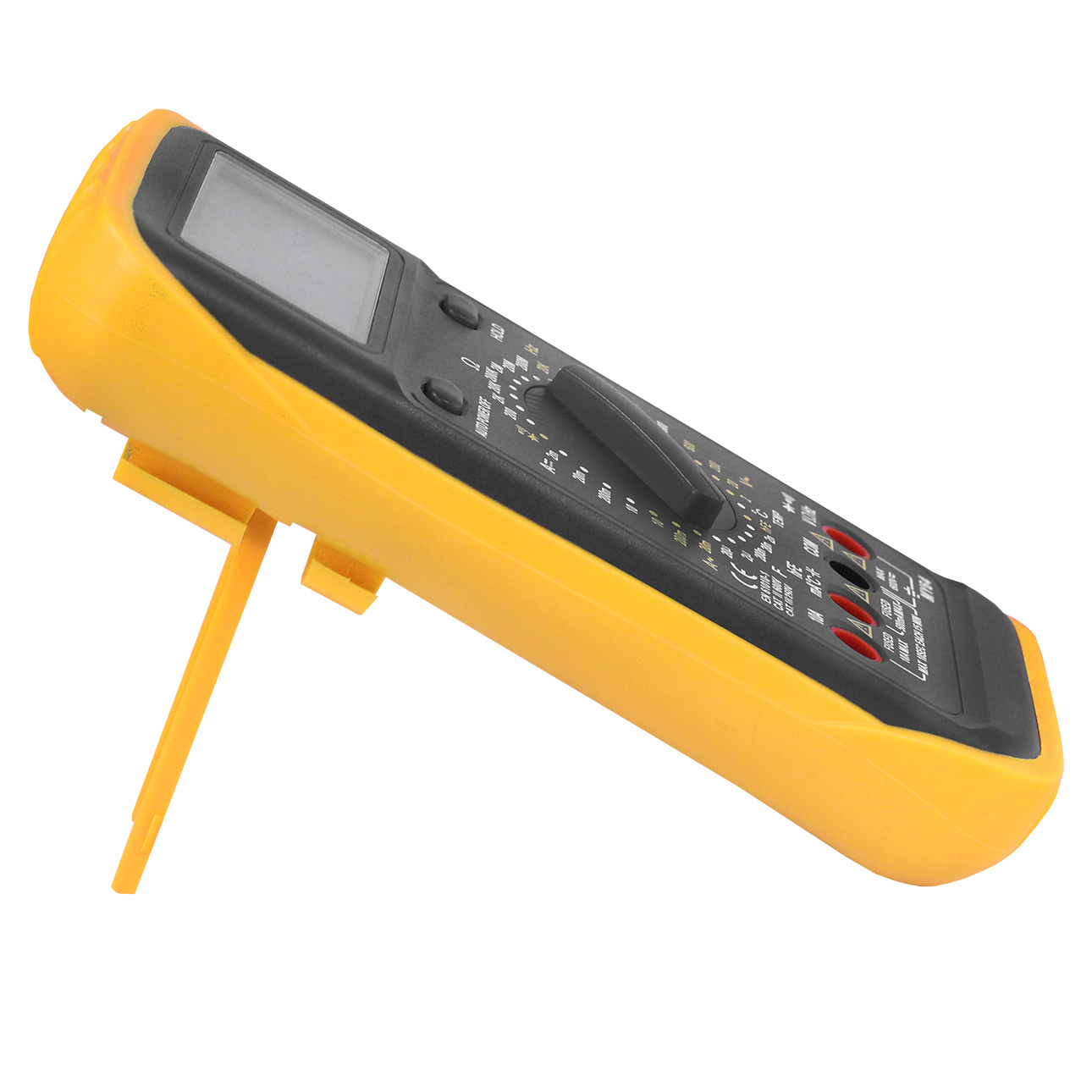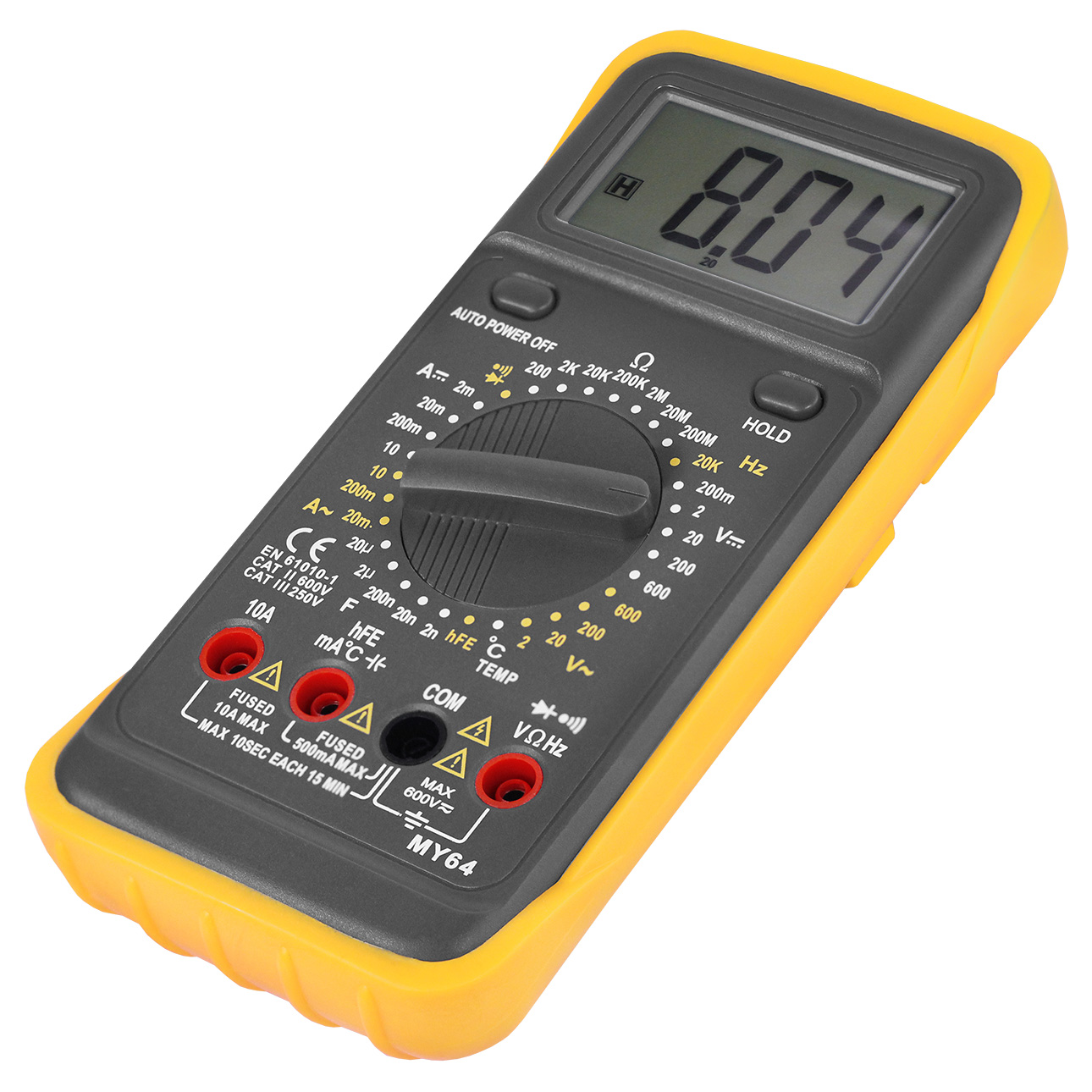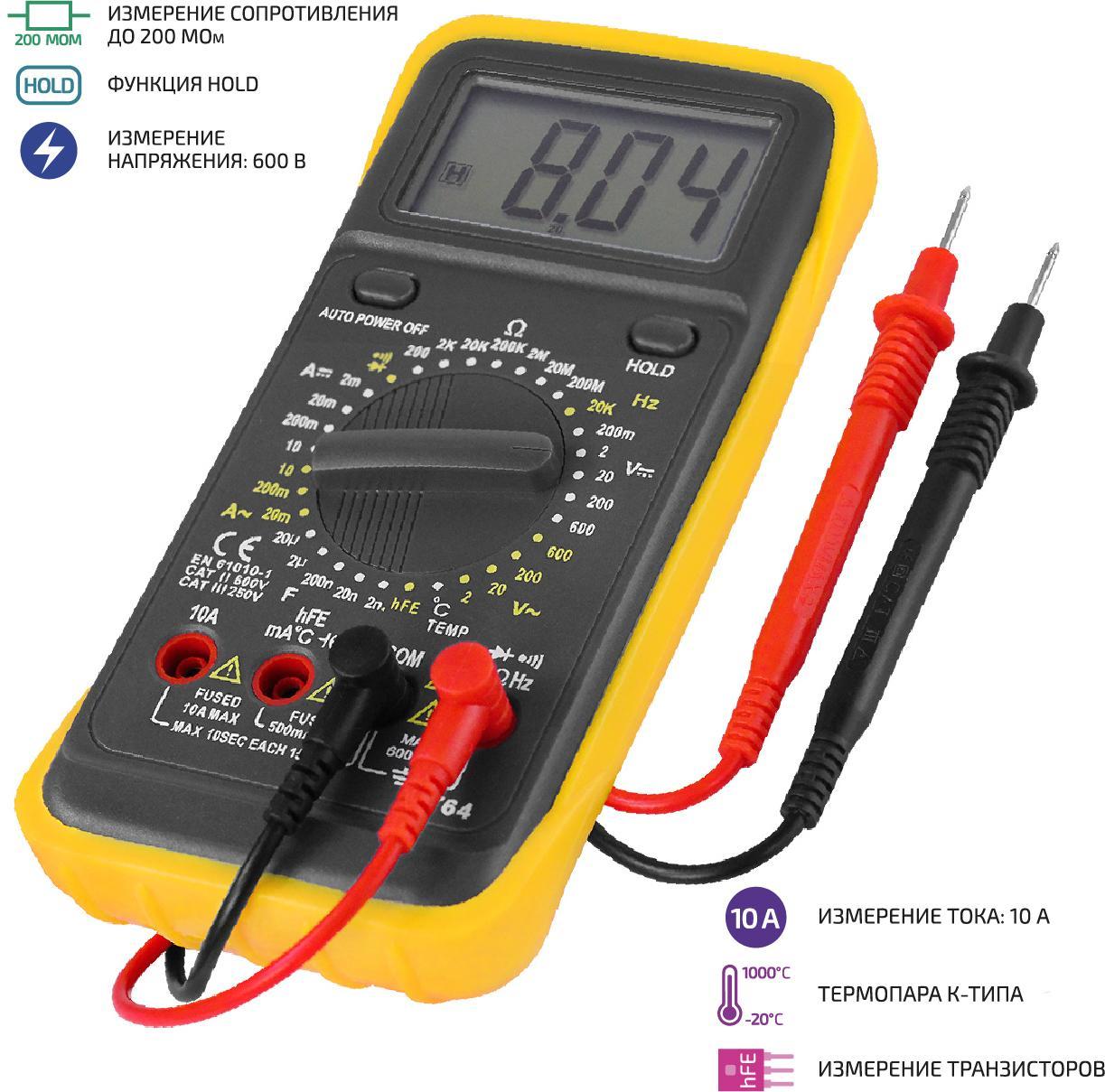 МЕГЕОН MY64 - это цифровой мультиметр с самым необходимым набором измеряемых параметров. Предназначен для применения в условиях лабораторий, обслуживания электрооборудования, бытового использования и сфере увлечений, радиотехники и несложного ремонта. Осуществляет измерения напряжения и силы постоянного и переменного токов, частоты, сопротивления, температуры и ёмкости. Также позволяет проводить проверки диодов, транзисторов и целостности цепи (прозвонка). В комплекте предусмотрен защитный холдер, в котором осуществляется безопасная транспортировка, эксплуатация и хранение измерителя. На обратной стороне расположена откидная подставка- упор для установки изделия под углом на рабочем столе, чтобы обеспечить удобное наблюдение за результатами на дисплее. Помимо этого имеются специальные места для крепления щупов.