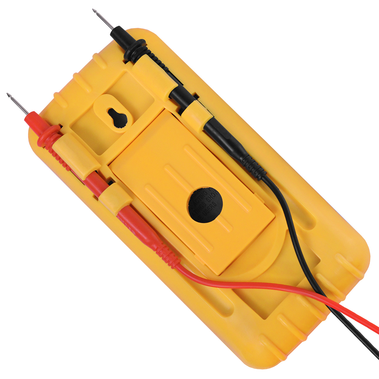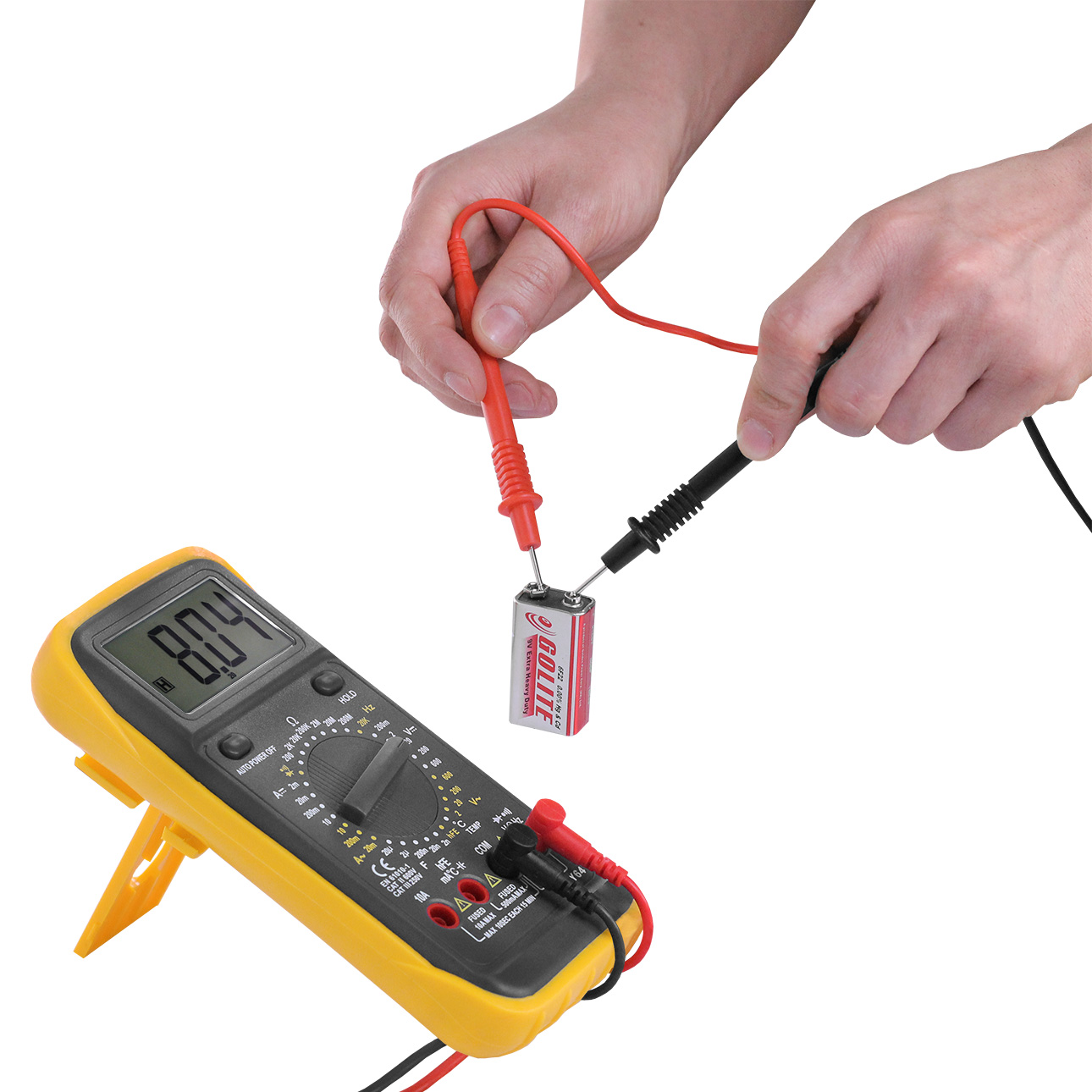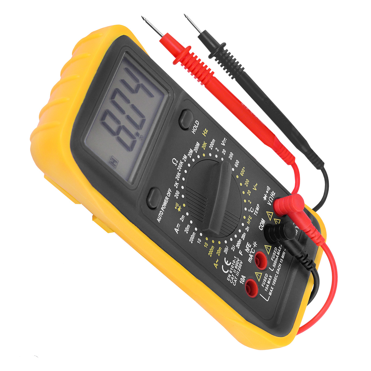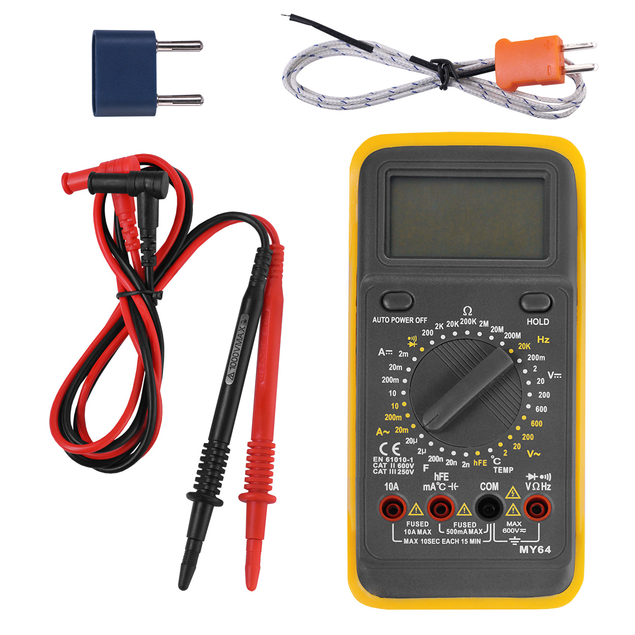 МЕГЕОН MY64 - это цифровой мультиметр с самым необходимым набором измеряемых параметров. Предназначен для применения в условиях лабораторий, обслуживания электрооборудования, бытового использования и сфере увлечений, радиотехники и несложного ремонта. Осуществляет измерения напряжения и силы постоянного и переменного токов, частоты, сопротивления, температуры и ёмкости. Также позволяет проводить проверки диодов, транзисторов и целостности цепи (прозвонка). В комплекте предусмотрен защитный холдер, в котором осуществляется безопасная транспортировка, эксплуатация и хранение измерителя. На обратной стороне расположена откидная подставка- упор для установки изделия под углом на рабочем столе, чтобы обеспечить удобное наблюдение за результатами на дисплее. Помимо этого имеются специальные места для крепления щупов.